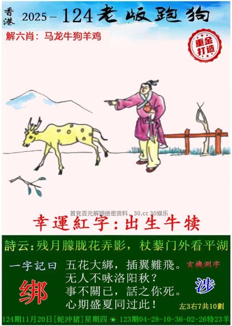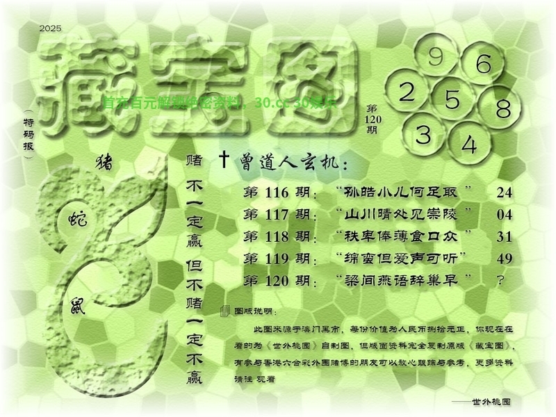125期藏宝图:【正是陶钧海内年】 浅解:正是陶钧海内年,解海解大数解25-49 综合生肖:牛虎猪狗蛇龙兔猴马 |
