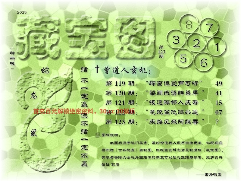 123期藏宝图:【来路风来阿魏香】 浅解:来路风来阿魏香,解风肖解兔虎龙 综合生肖:牛猴狗猪鼠羊虎兔龙 |